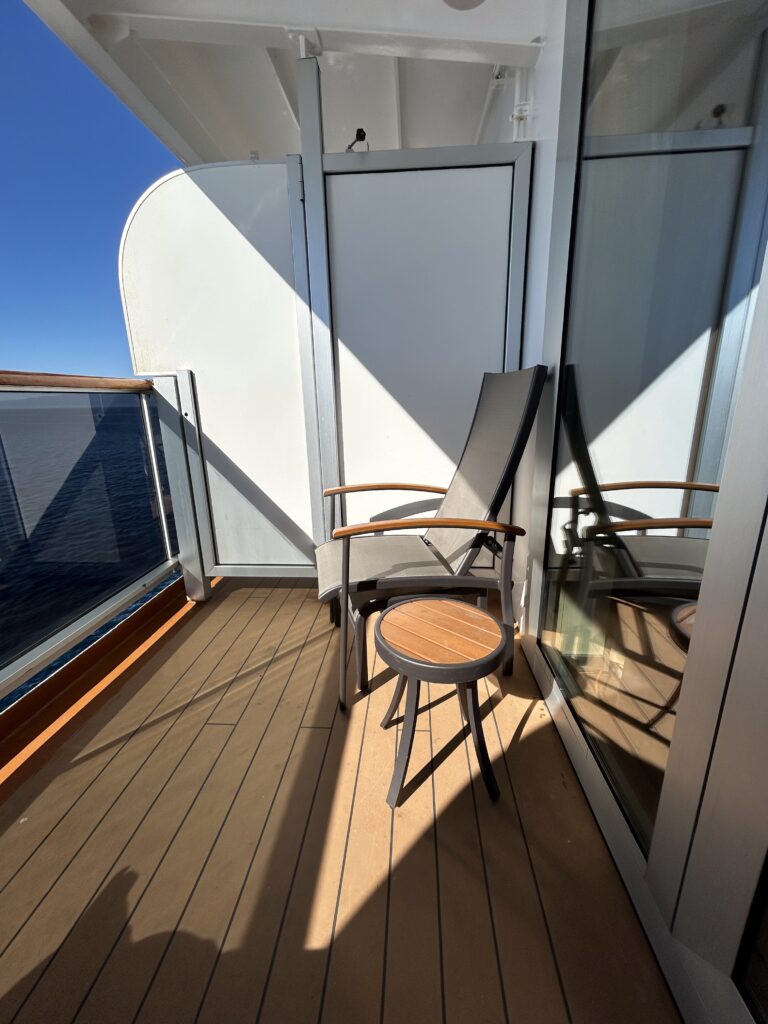 My balcony cabin was comfortable with plenty of storage even for a longer cruise. The balcony had plenty of room and a lovely view with the glass enclosure. If you like even a larger balcony consider Deck 4 aft starboard. I was in 5153 and in looking down from the balcony they appeared to be about 2’ wider.